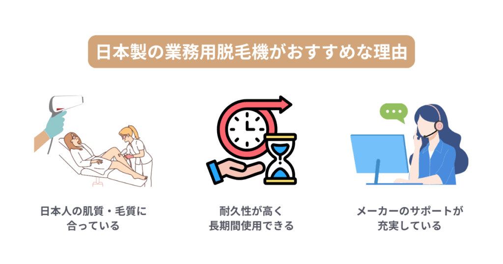ここからは、日本製の業務用脱毛機がおすすめな理由を深掘りながら紹介します。