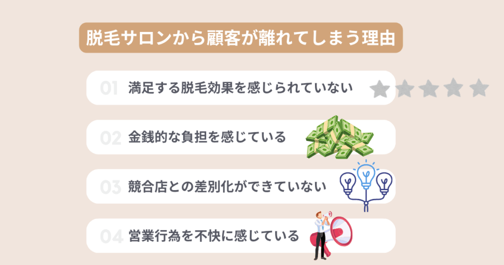 脱毛サロンから顧客が離れてしまう理由として、以下の4つが考えられます。